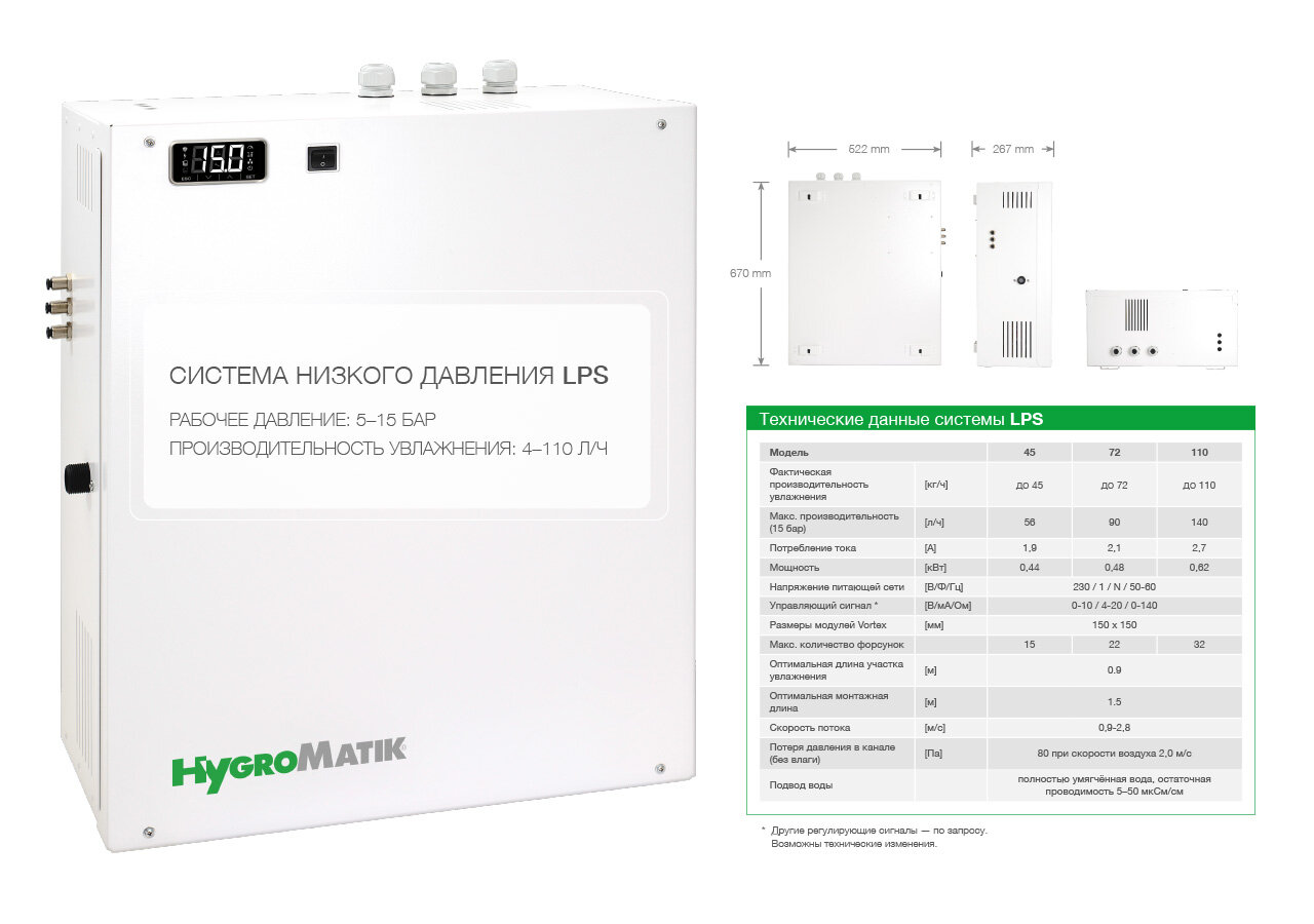 Благодаря модульной конструкции систем увлажнения LPS и HPS их можно установить практически в любой (в том числе уже эксплуатируемый) климатический канал. В общей сложности 5 классов производительно- сти позволяют найти идеальное решение вашей задачи по увлажнению воздуха. Производительность до 110 л/ч обеспечивает LPS — компактная система увлажнения, работающая в диапазоне низкого давления от 5 до 15 бар (Low Pressure System). Более мощная система HPS охватывает диапазон высокого давления от 25 до 75 бар (High Pressure System) и обеспечивает производительность увлажнения до 600 л/ч.