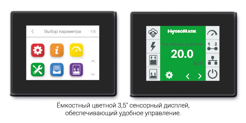 Устройства FlexLine поддерживают диапазон 200–690 В / 3 фазы. Сопротивление изоляции может составлять > 50 MΩ, что важно для электродных паровых увлажнителей воздуха. Мощная электронная система управления обеспечивает исключительно быстрое регулирование, с ней легко работать благодаря сенсорной панели оператора.